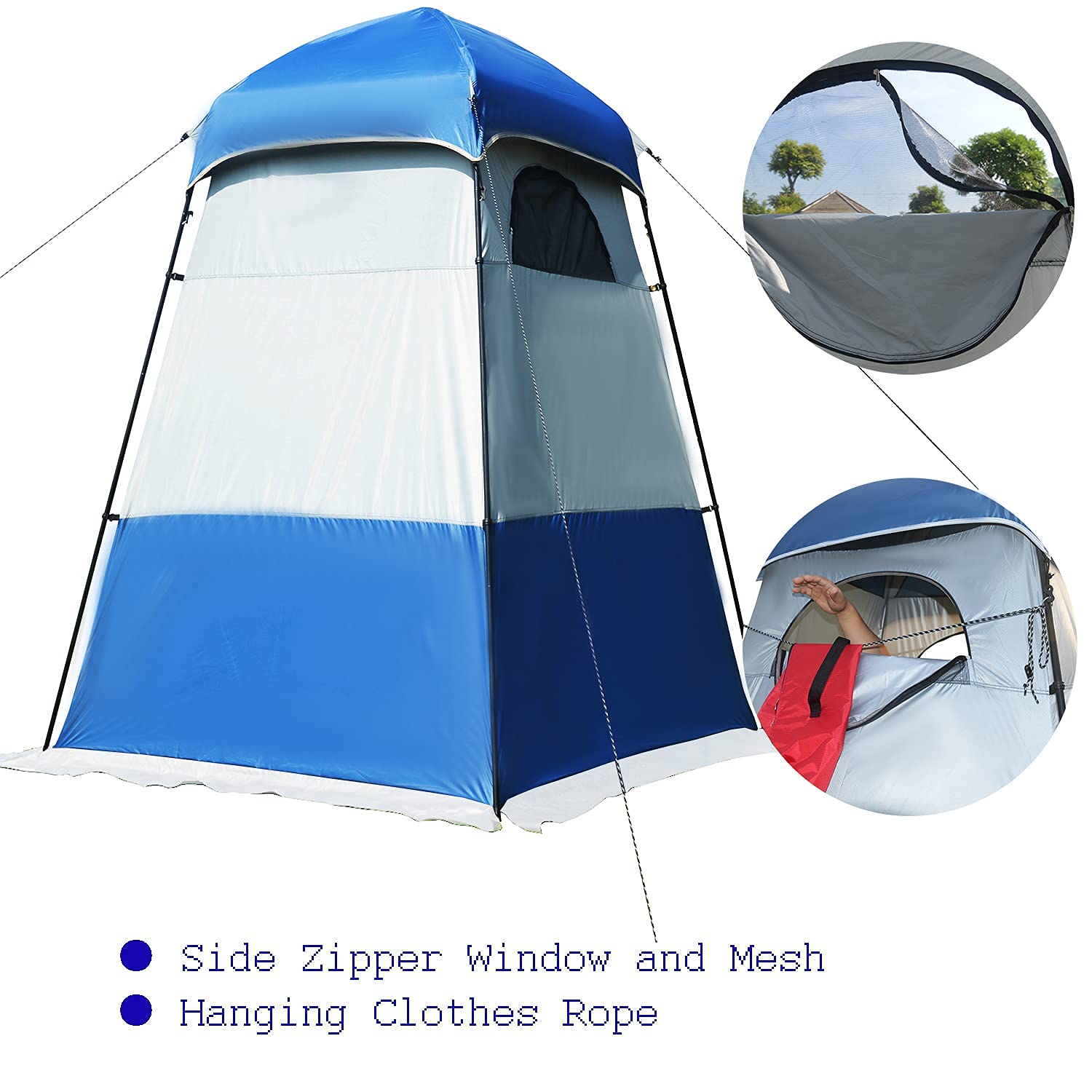 - 【CONSIDERATE DESIGN】:1.Double zipper for the door and window, which can be convenient for opening the door in or outside the tent;2.Hook on the top of the Bathroom Camp can hang lights or spray; 3.One big water-proof Storage Packet can well protect the clothes and user belongings,two Mesh Bags are designed for holding your Shampoos or daily appliance; 4.Clothes Hanging Rope outside the Privacy Shelter is very convenient for drying the clothes or towel.