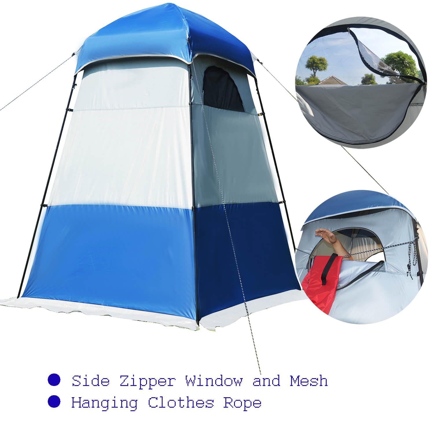 - 【DOUBLE MESH WINDOW】Window in the privacy shelter has double layers,the outer fabric window is designed for keeping the privacy for the shelter, and the inner mesh window is for ventilation and keeping insect and mosquito.