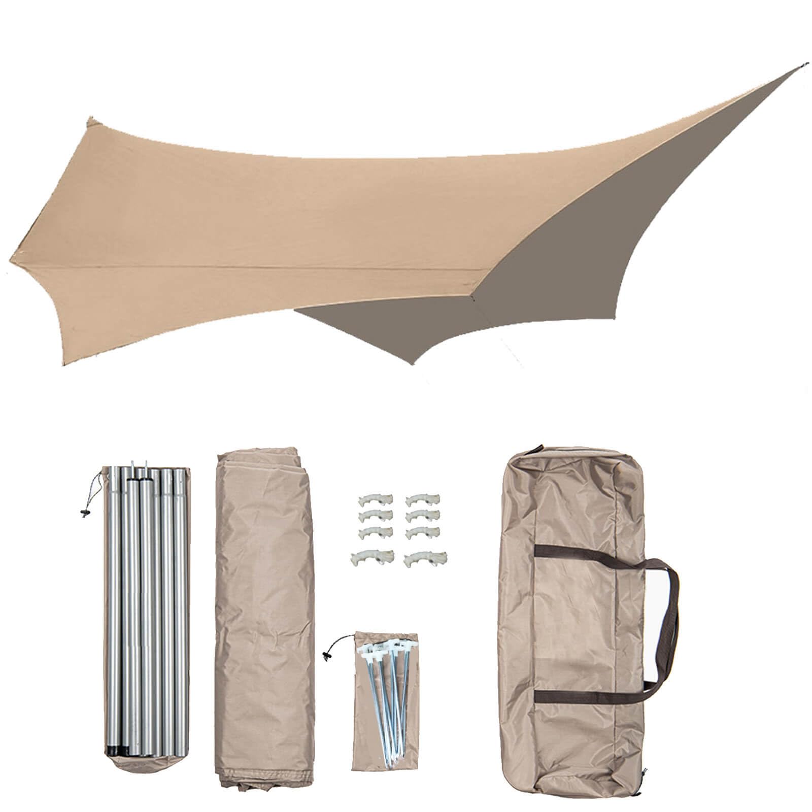 - Premium Quality Accessories- This high-quality camping hammock rain fly set contains all the necessary components for setup. Comes with 1 rainfly tarp, 2 multi-section support poles,10 aluminium stakes with reflective paracord ties, 8 adjustable ropes, and 1 carrying pouch for all your gear.