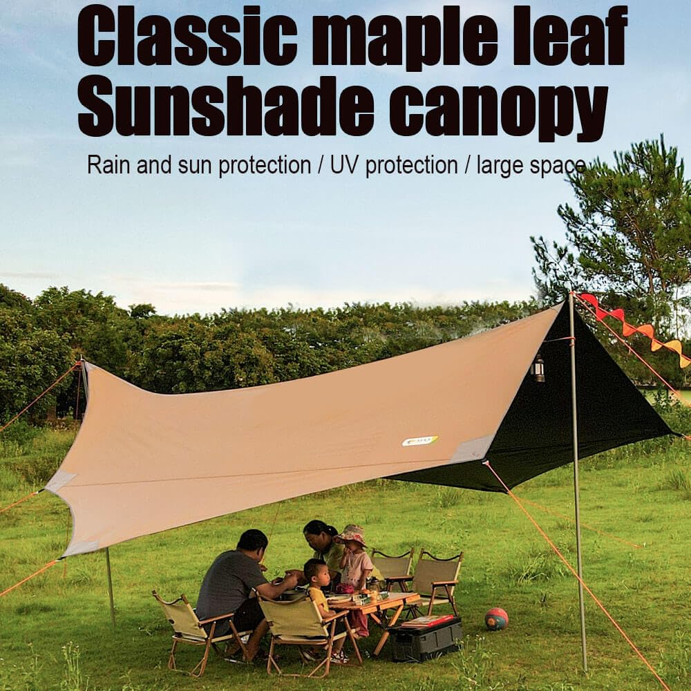 - Larger Shade & Easy Setup - MOQI camping rainfly tarp enough to provide outside shade and shelter for 8 to 12 people, meeting the needs of small to medium-sized campsites. The maple shape rainfly tent tarp is simple to set up, making camping a more relaxed and enjoyable experience.
