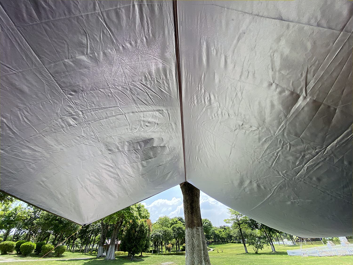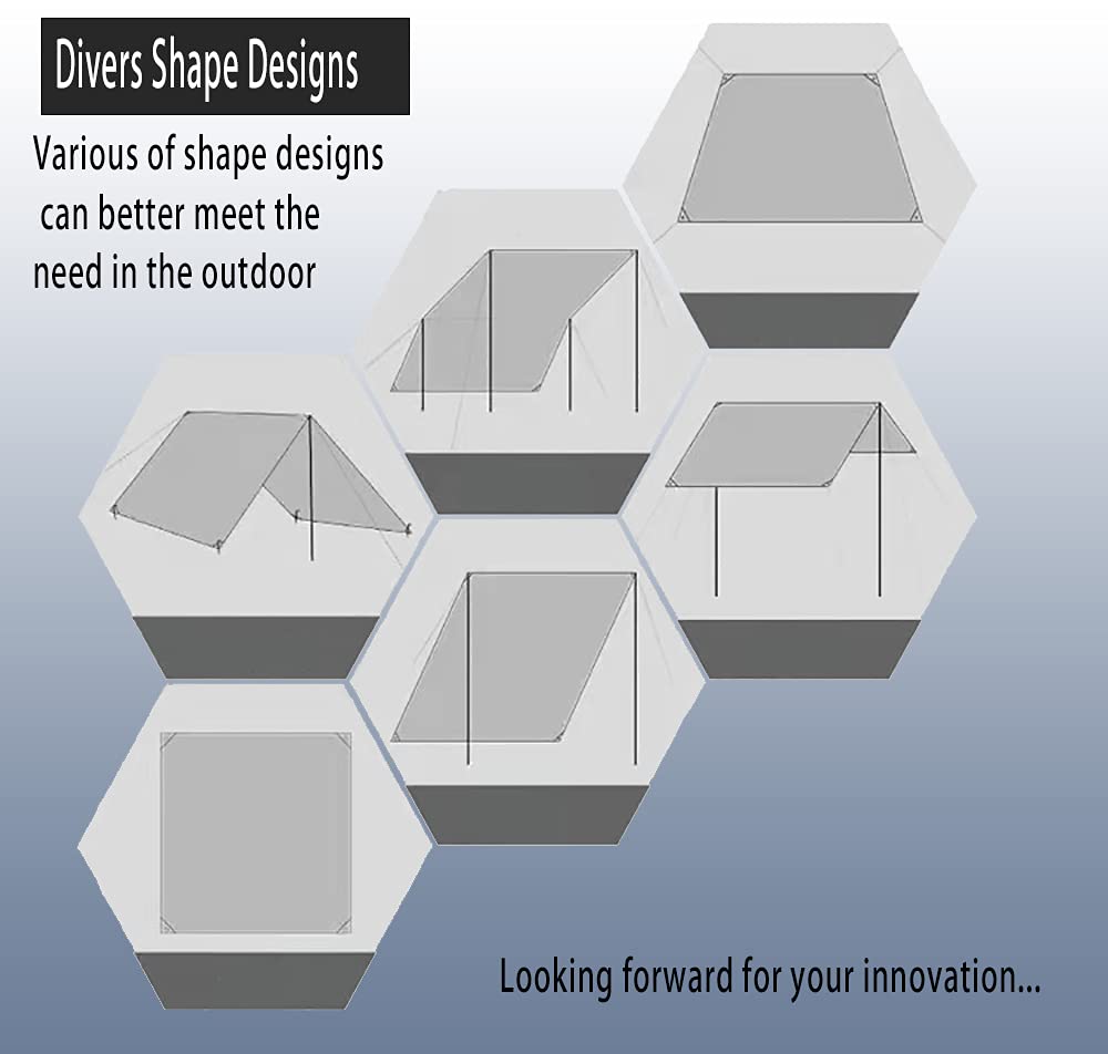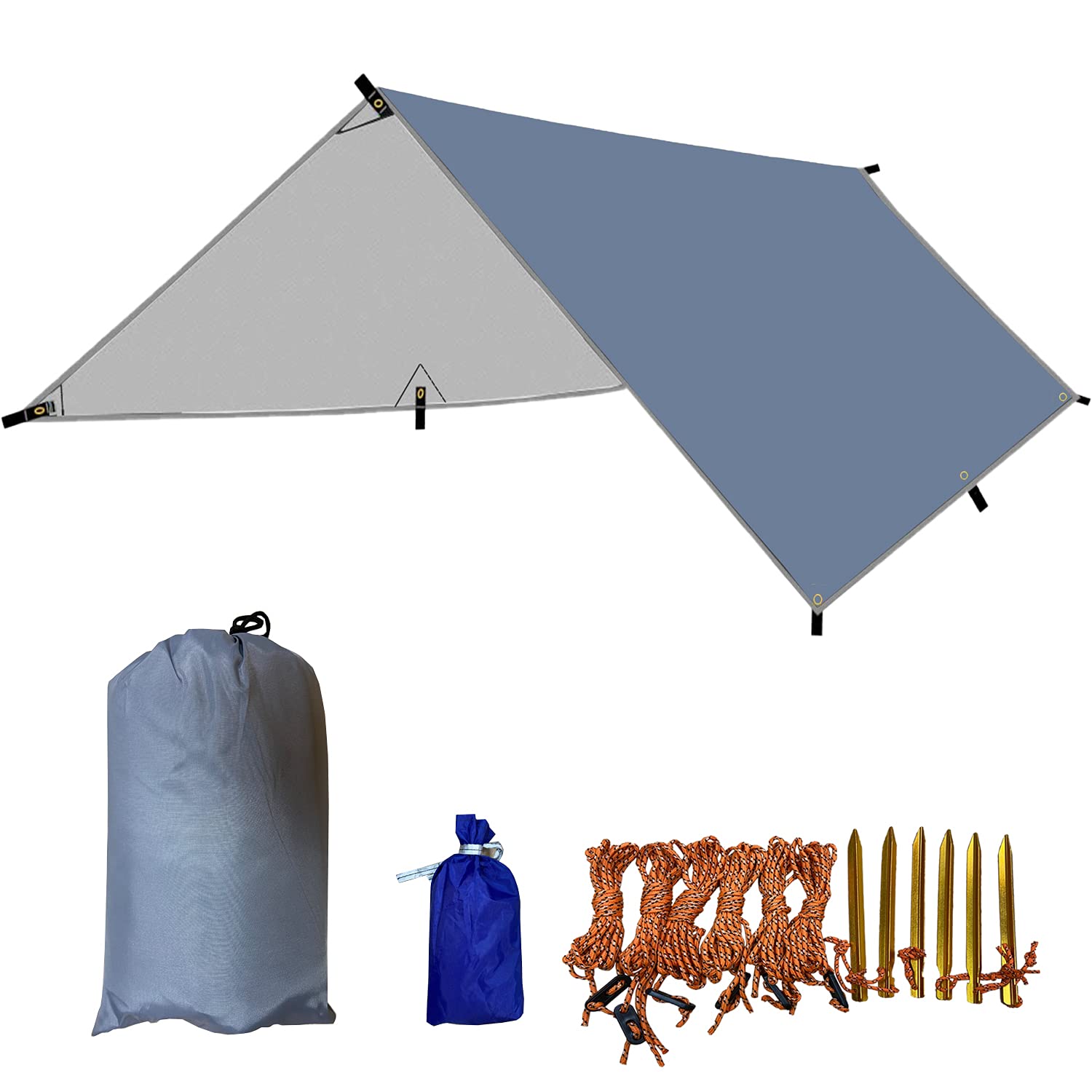 - 【WATER PROOF】The tarp tent coated with PU 3000 mm inner layer, it can provide a waterproof use and UV protection for the user, it can be a sunshade tarp and a rain fly shelter perfectly at the same time. Besides greatly reduce your anxiety of leaking and wet through when you make a camping or resting at the outdoor, It can quickly getting dry to help you save more time in packing and hurrying on your journey.