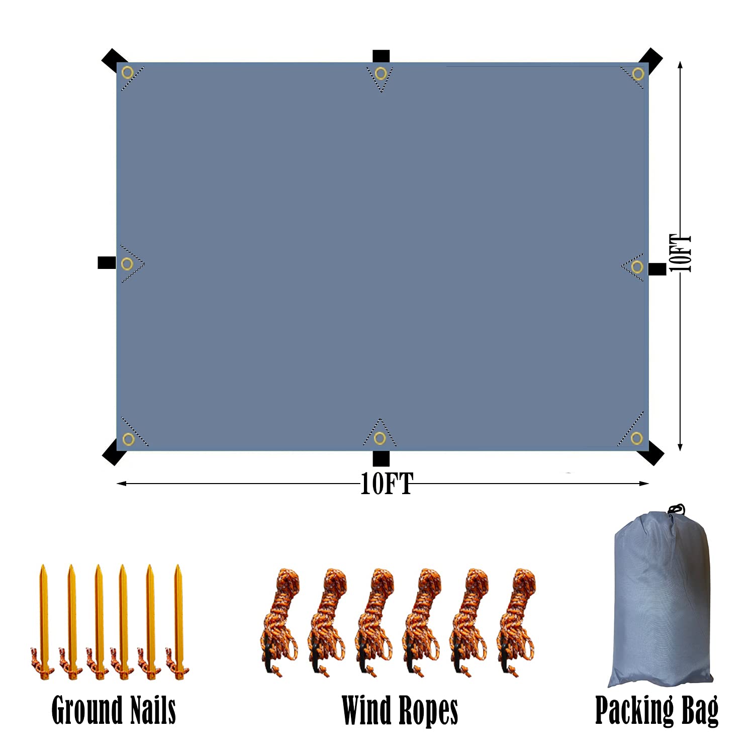 Camping Tarp Hammock Rain Fly, 100% Waterproof Lightweight Premium Shelter Tent, 10 x 10 FT Ultralight Backpacking Shade Cover. (Light Grey)