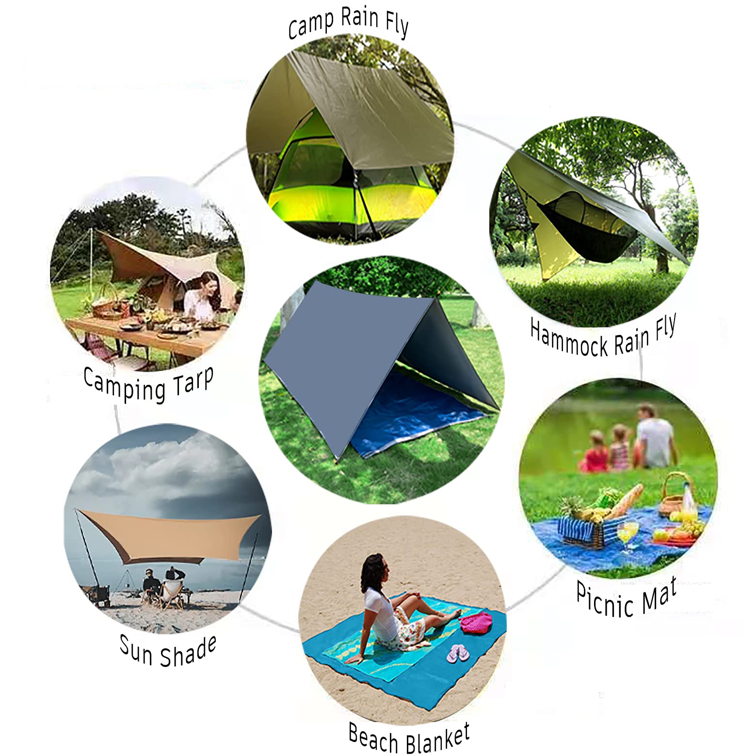 The camping tent tarp is a multi-functional hammock rain fly tarp, which have many different ways to use as sun shade tent, camp Rain Fly Tarp, emergency shelter, picnic mat, beach blanket, footprint tent etc. It is very convenient to carry and set up in traveling, camping, hiking and fishing.